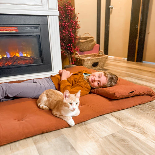 Our Japanese-style floor bed uses a 100% cotton cover with layered high-density memory foam and breathable hollow fiber, providing durable support and all-night comfort.